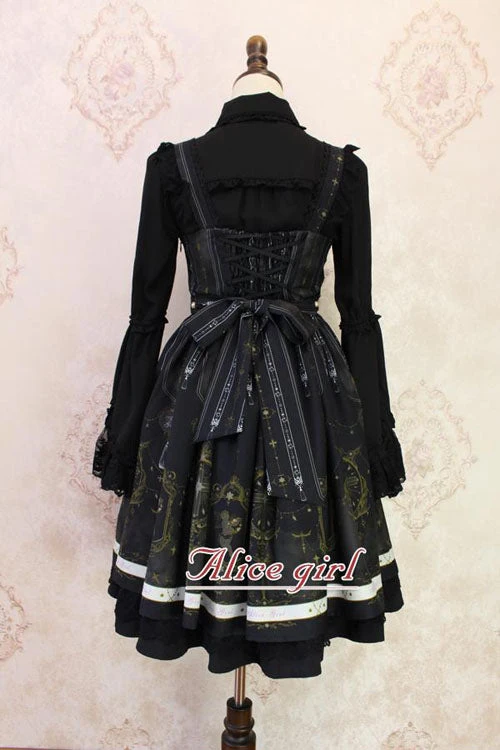 Black Ruffled Strap Mesh Lantern Sleeves High Waisted Irregular Hem Gothic Lolita OP Dress