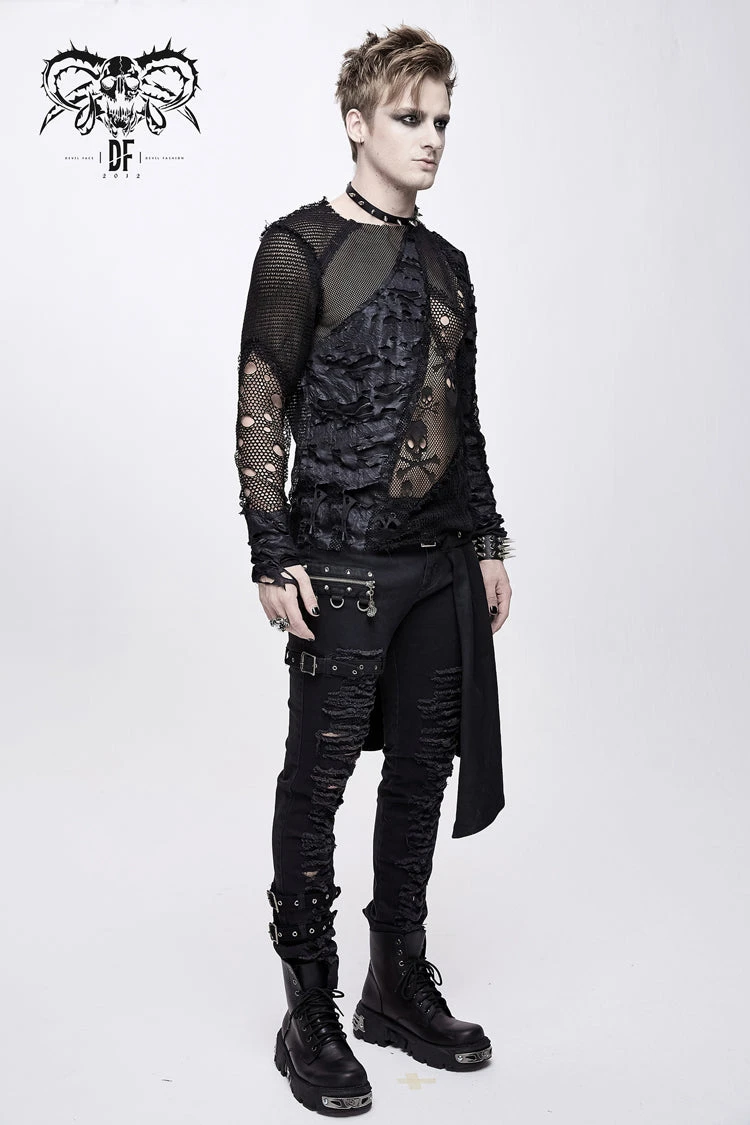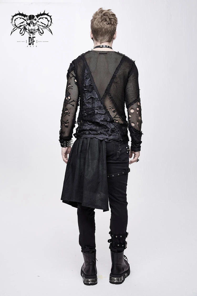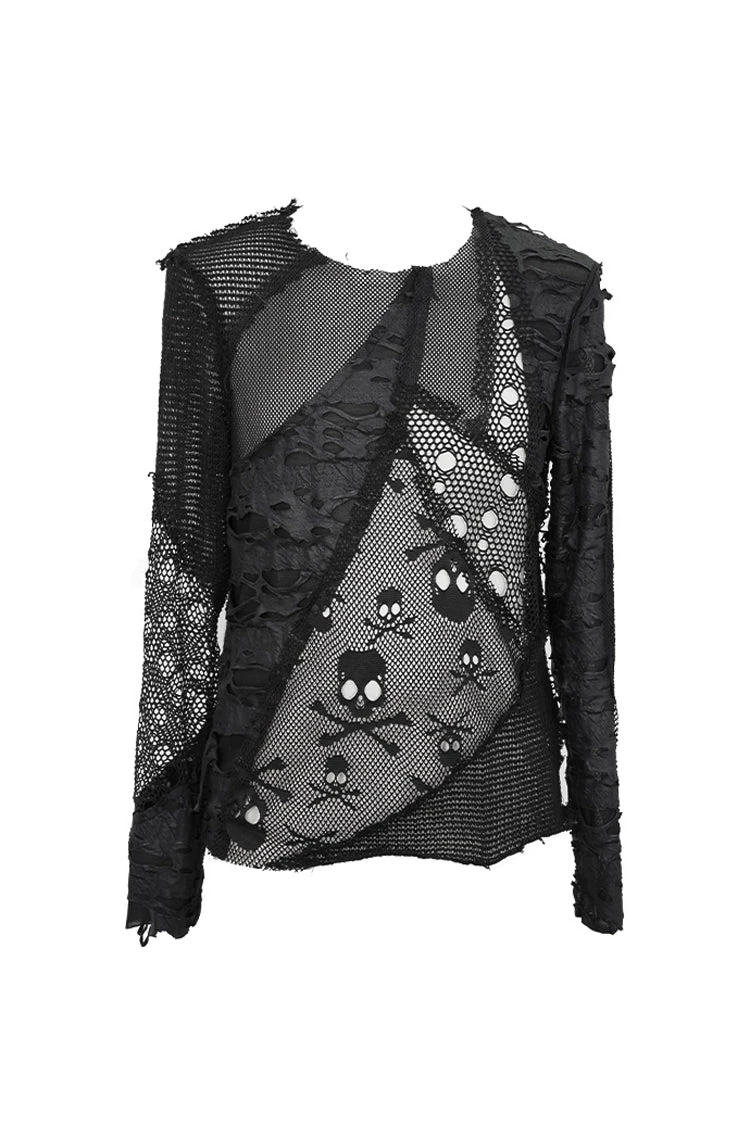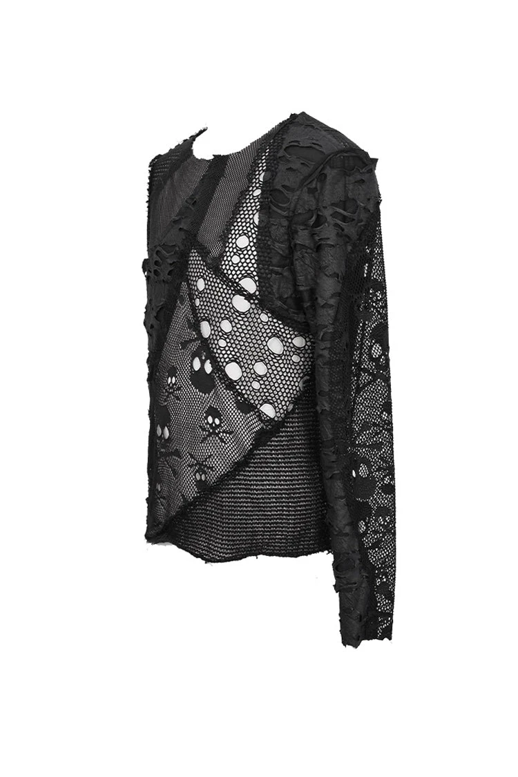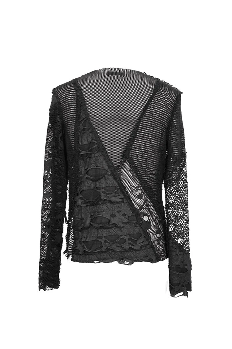 A variety of mesh materials are asymmetrically stitched into a basic style round collar long sleeve T-shirt,unedged treatment, increased the decadent sense.