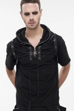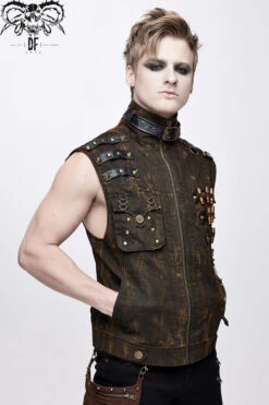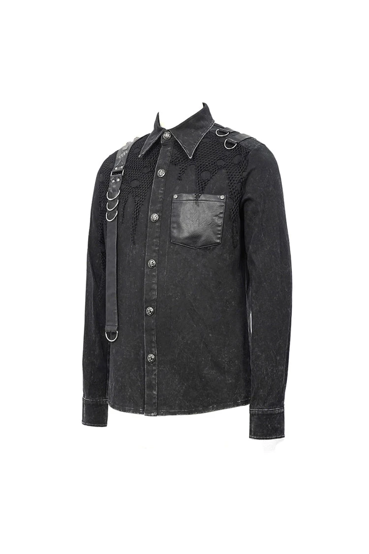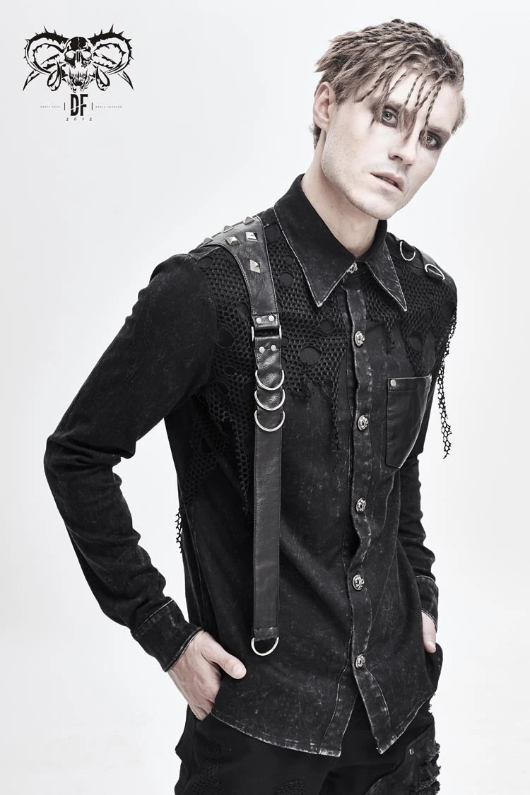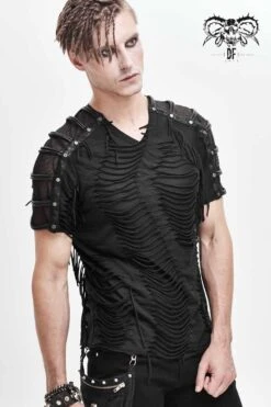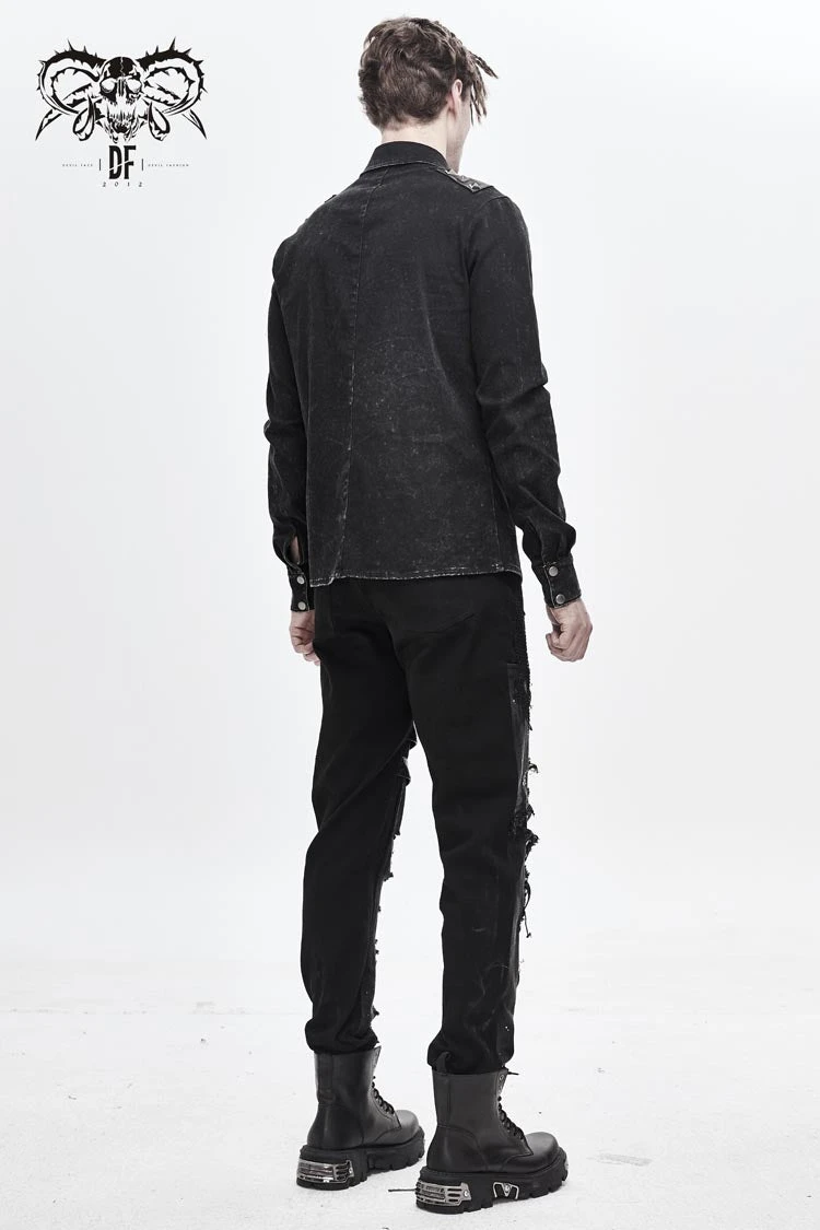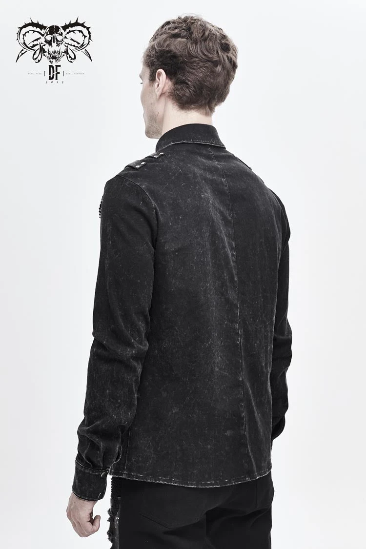 Asymmetric design,the left shoulder design is similar to loop design,left-right asymmetry, semi-finished water washing and worn out process, front center with pattern snap button.