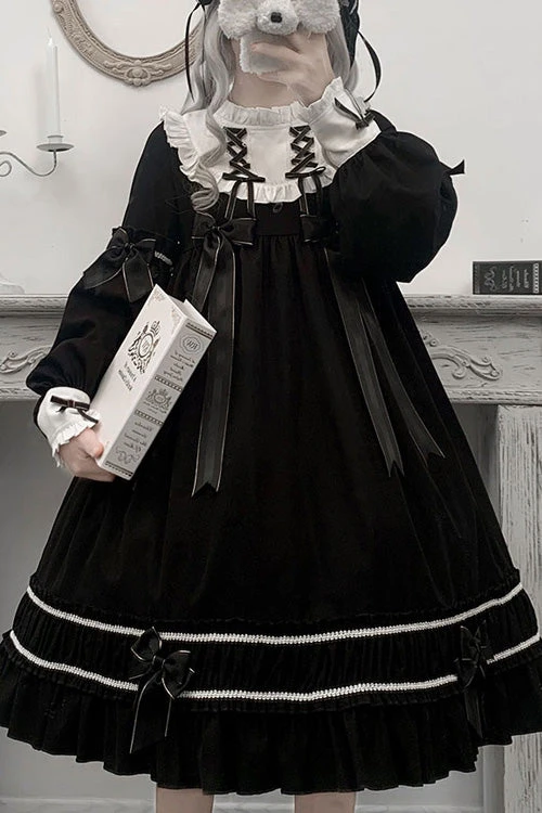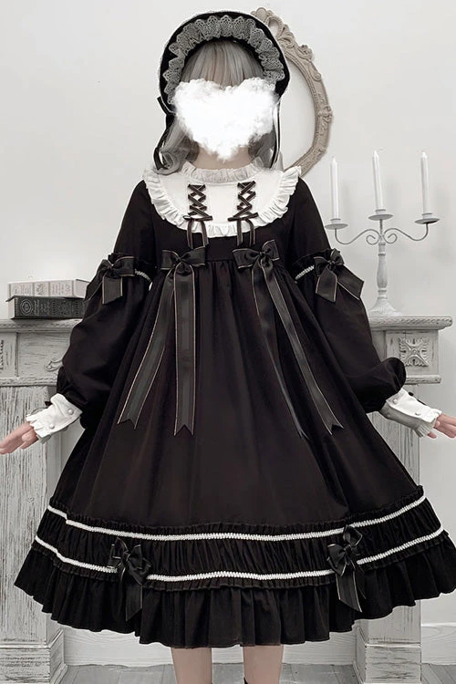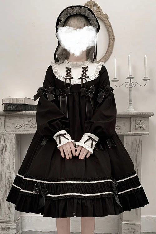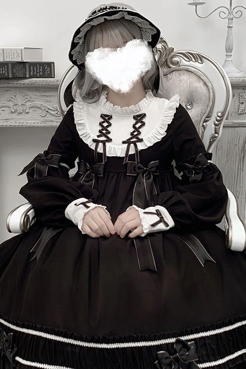 Black Square Neck Organza Print Ruffled Lantern Sleeves High Waisted Sweet Lolita OP Dress