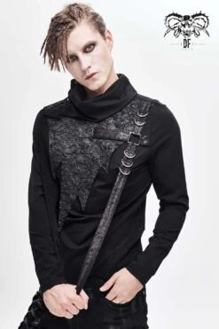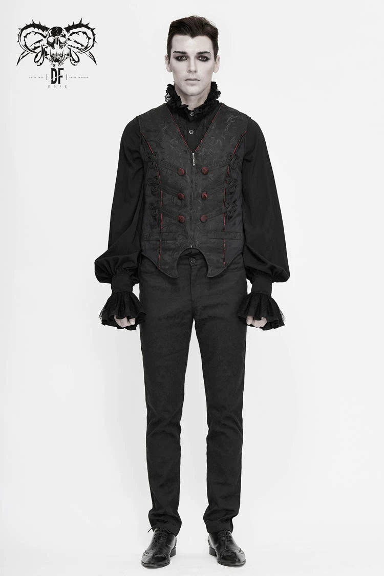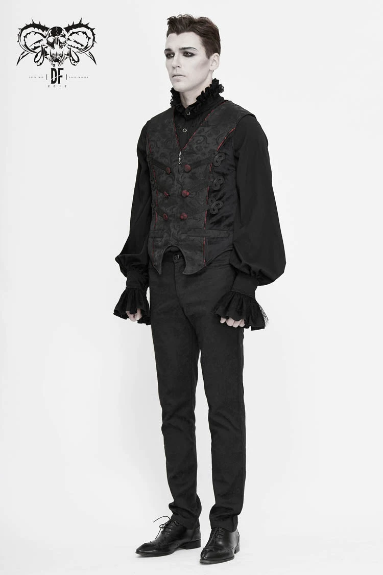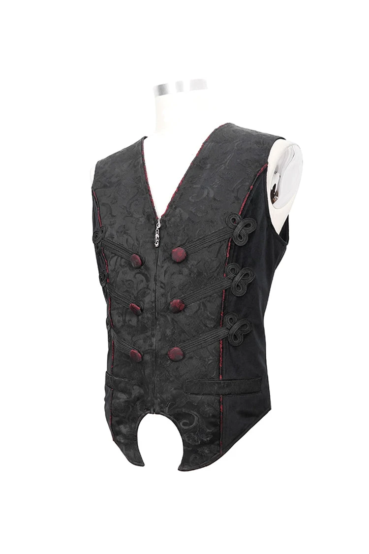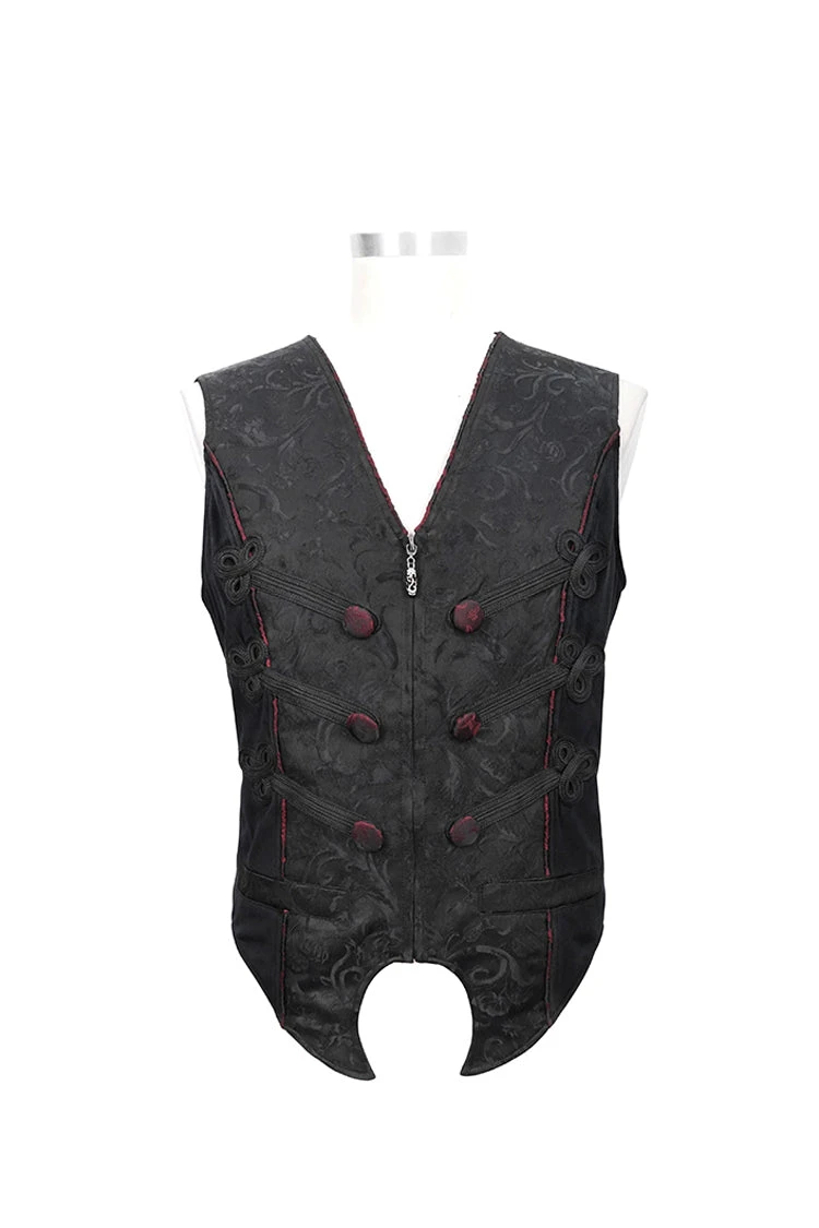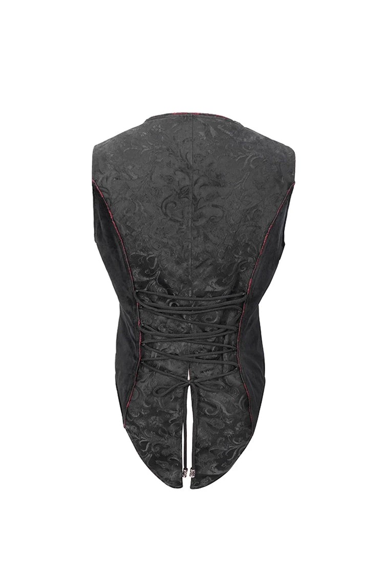 The main material is black dark fringe jacquard fabric, the side is separated by knitted velvet fabric, and the bud is decorated with red dark fringe jacquard fabric, and two sides center front of the plate buttons with contrast color covered button echos.The lace up center back as adjustment,At the end of the rope bell hung for decoration.