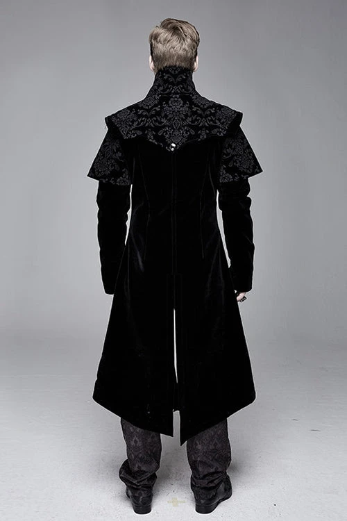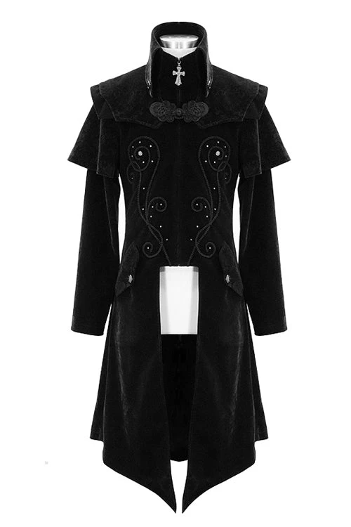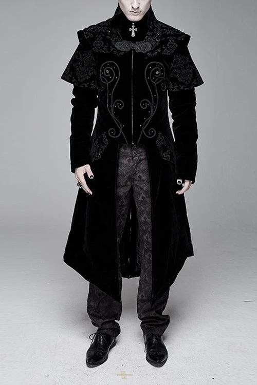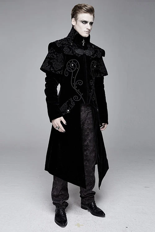 The whole piece is made of weft velveteen fabric, the shawl collar is made of flocking printed velveteen fabric, the waist is decorated with hand-embroidery and cross rivets.
