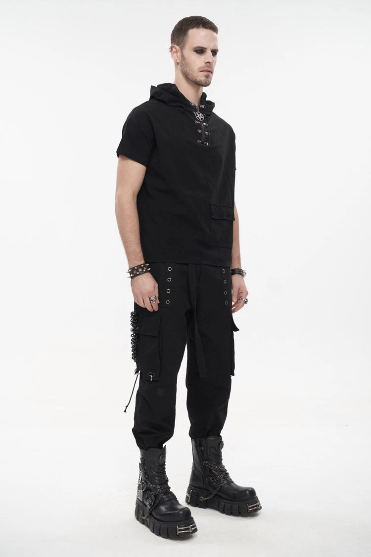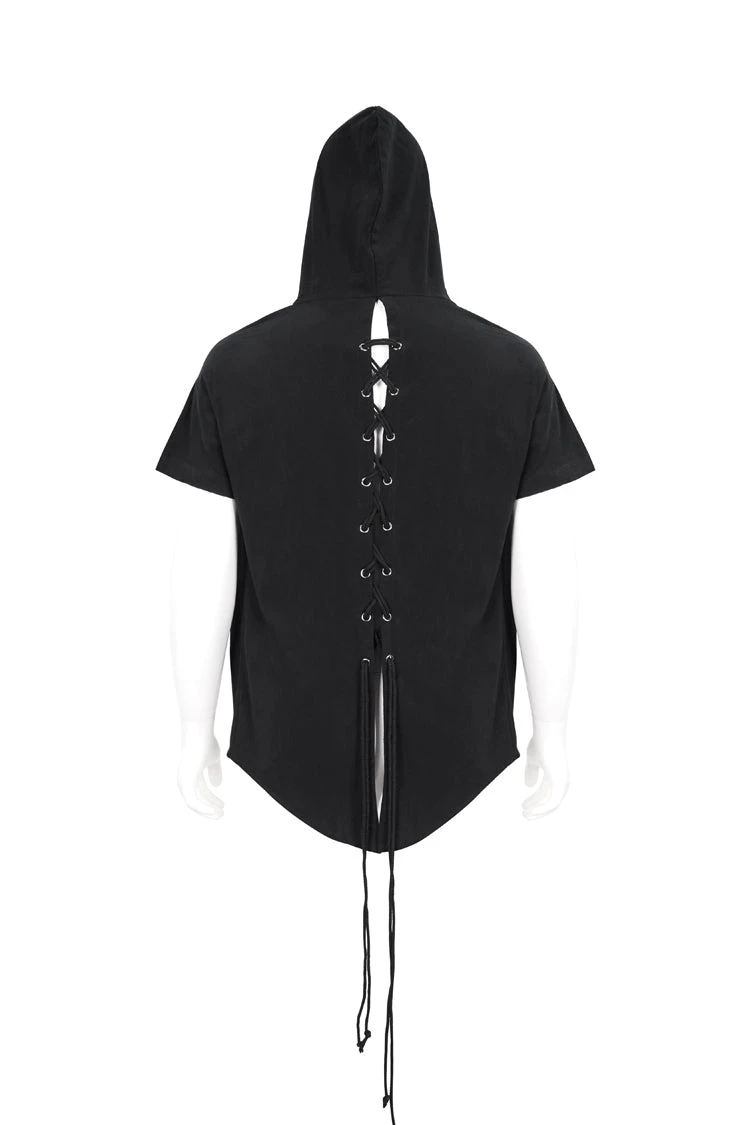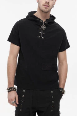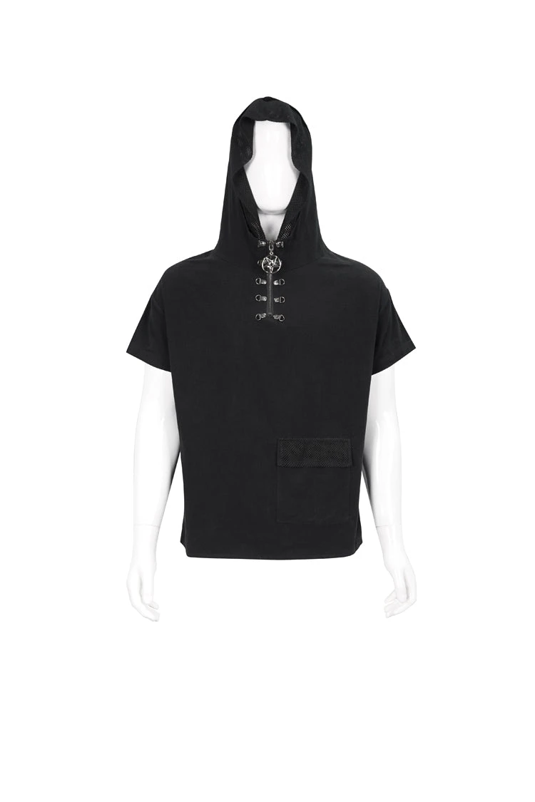 The main fabric is a non-stretch weave in a loose, hooded fit with a middle front zipper and a ripped eyelet at the back for cording.
