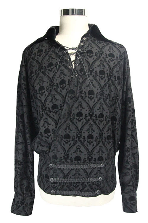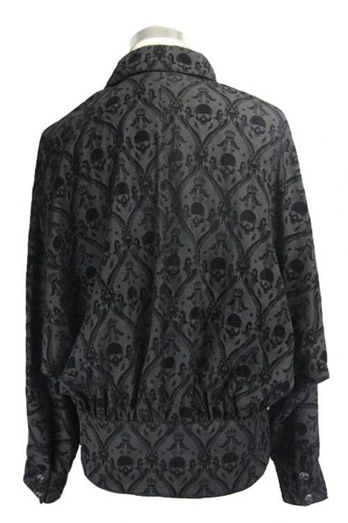 The whole piece is made of skull flocking printed shirt material,tying neckline, inclined placket and hem stitching with 3D braid,snap button can be opened.