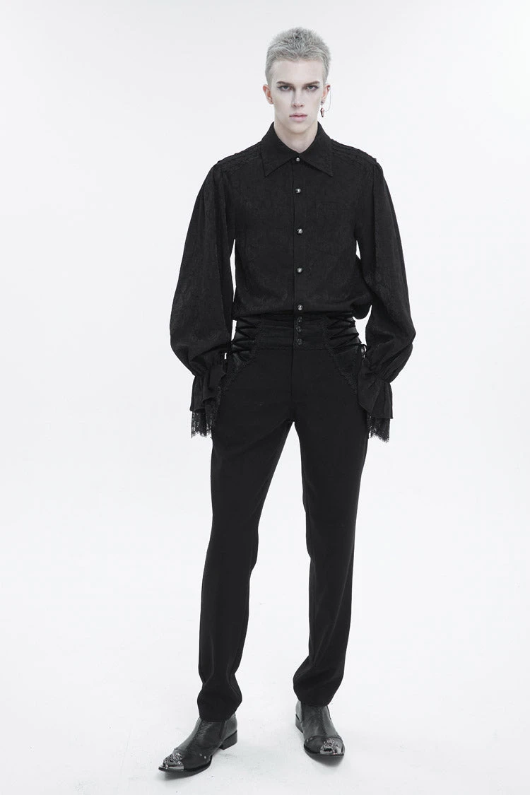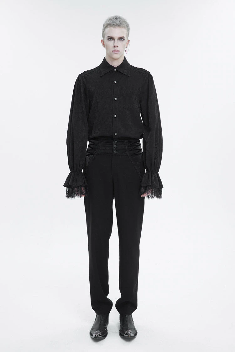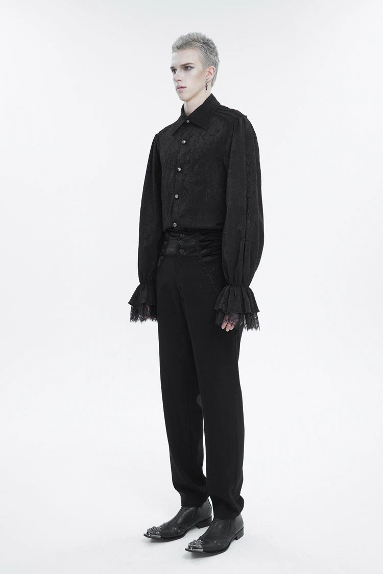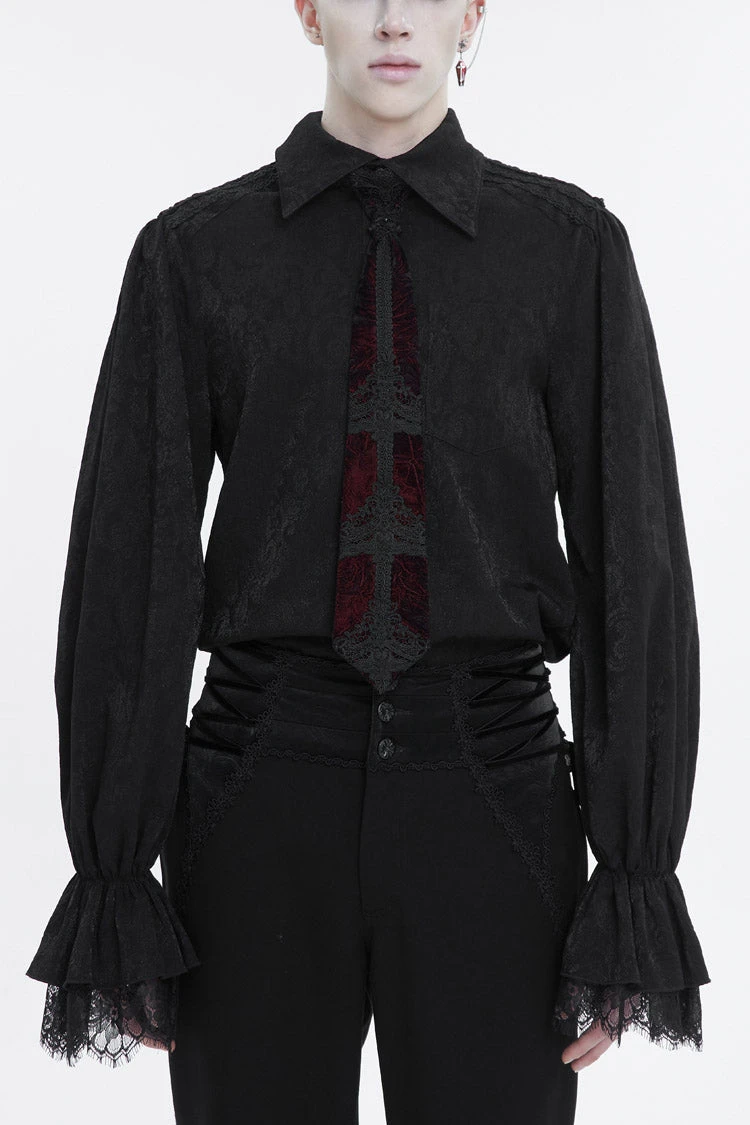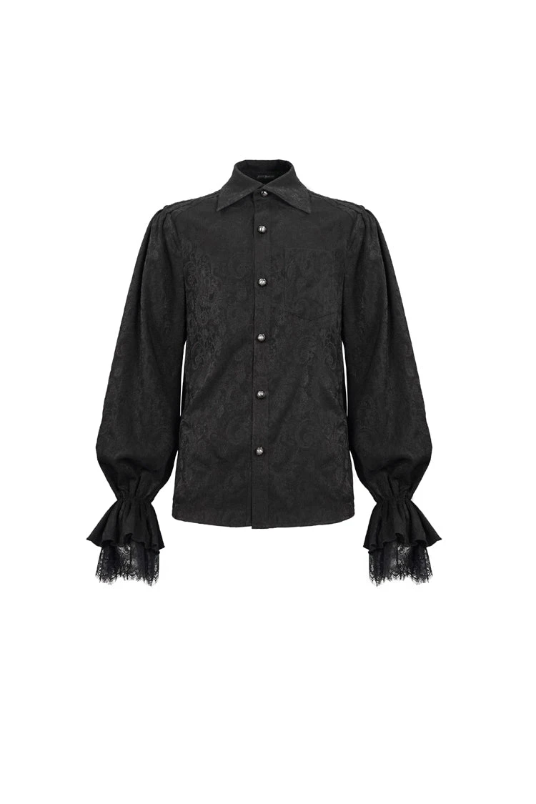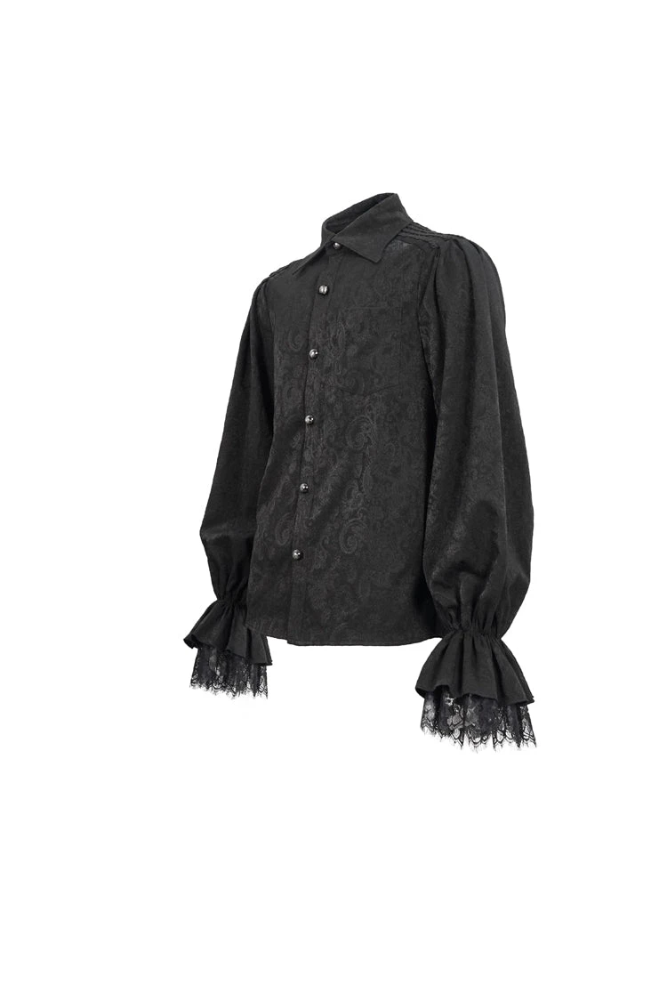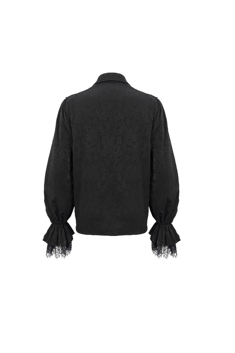 This gothic shirt is a turn-down collar and puff sleeves. Flared cuffs patchwork with lace. Weaves trim embellished shoulder. Detailed buttons for closure. Floral embossing on the fabric.
