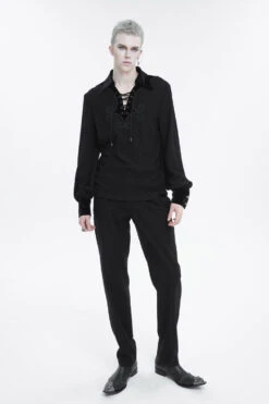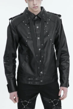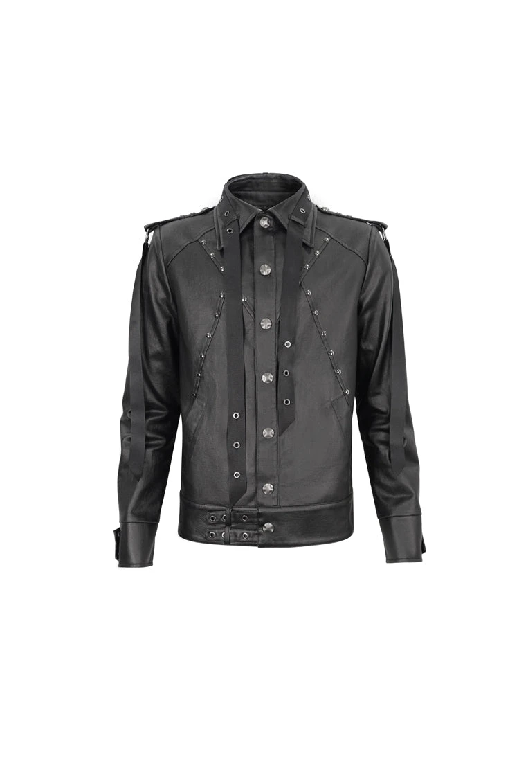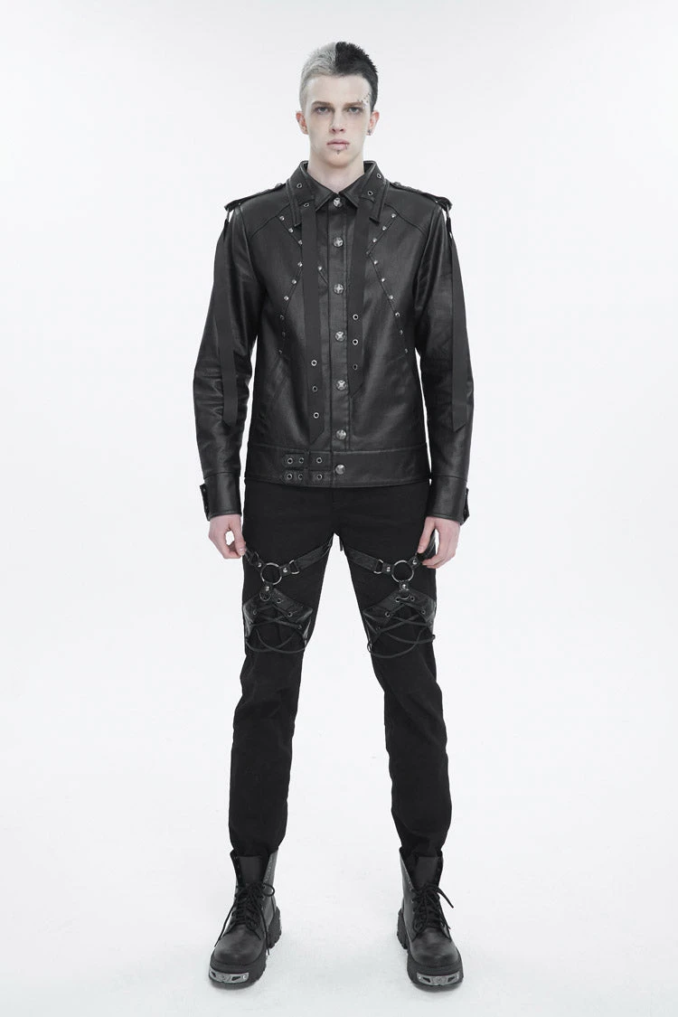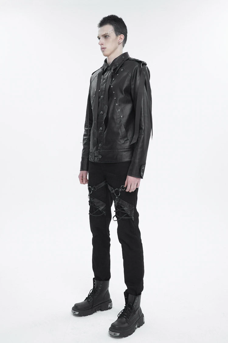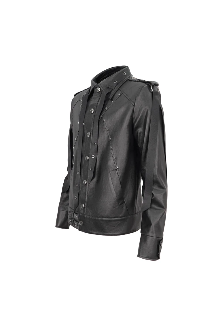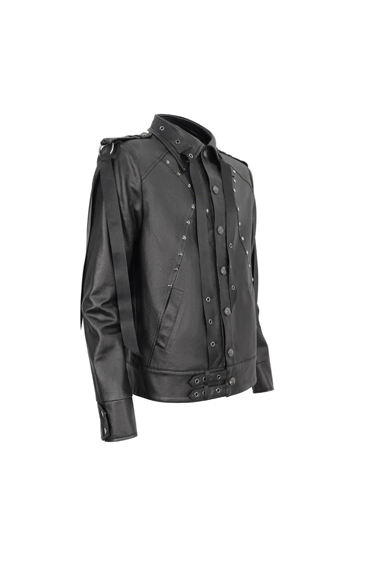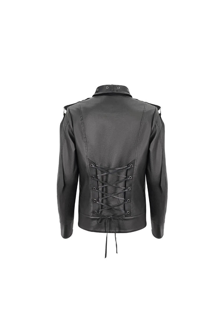 The punk jacket is patchwork with eyelet straps on the shoulder and a turn-down collar. Nailed on the front, lace-up on the back, and buttons for closure.