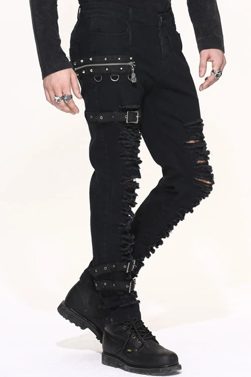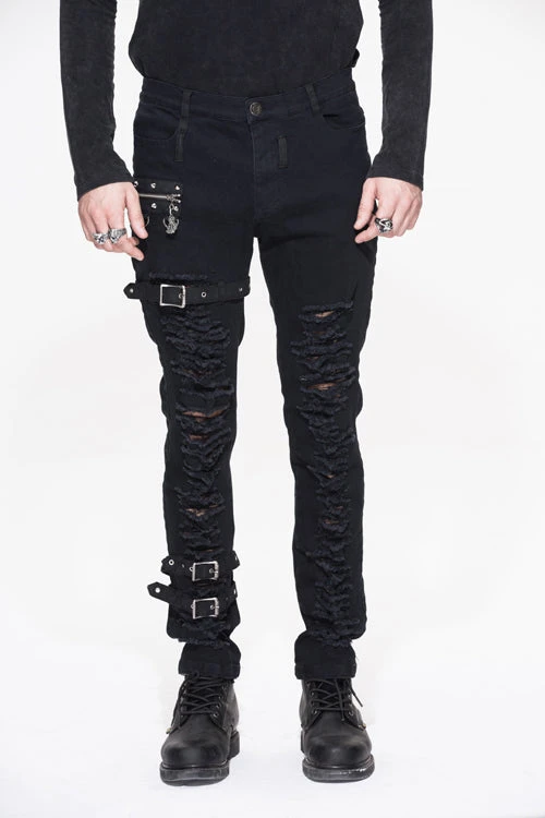 The whole piece trouser is made of black elastic twill fabric, which is worn by washing water through lacerating holes. The asymmetrical loops were stitched on the pants leg,which can be adjusted with buckles and corns.Suitable for daily wear in four seasons.