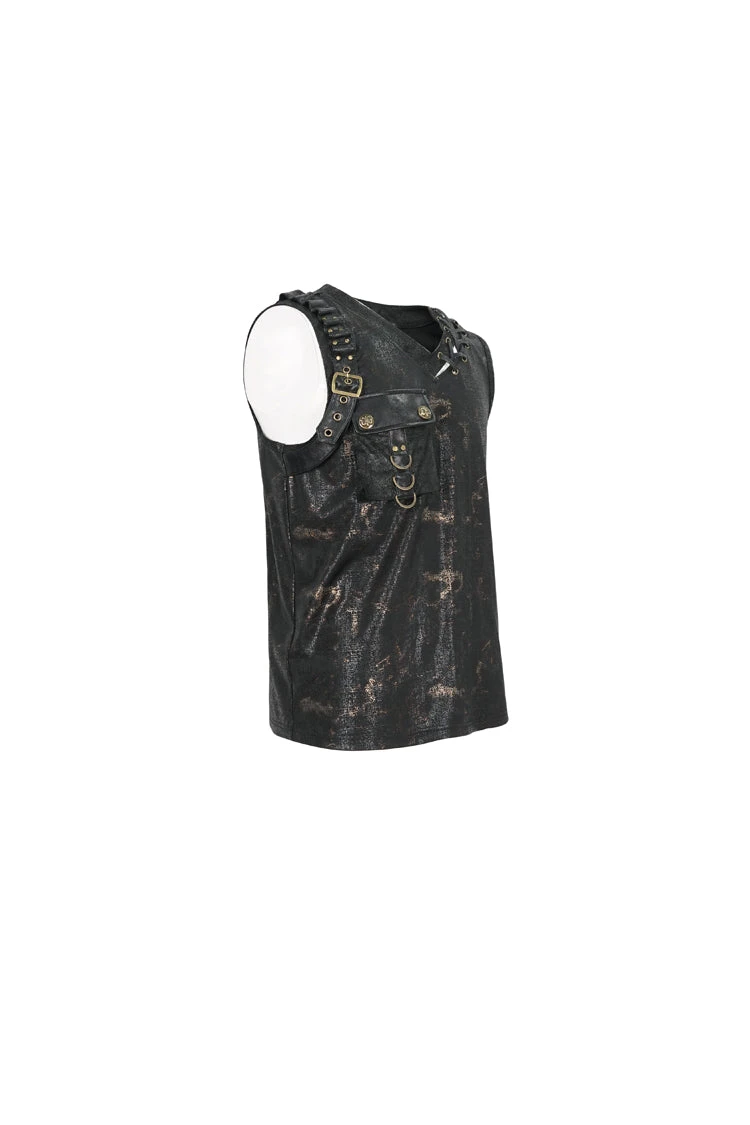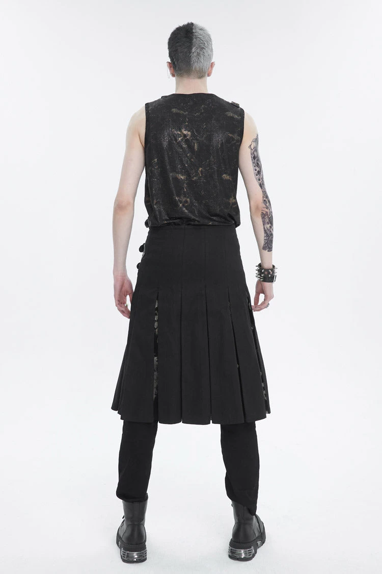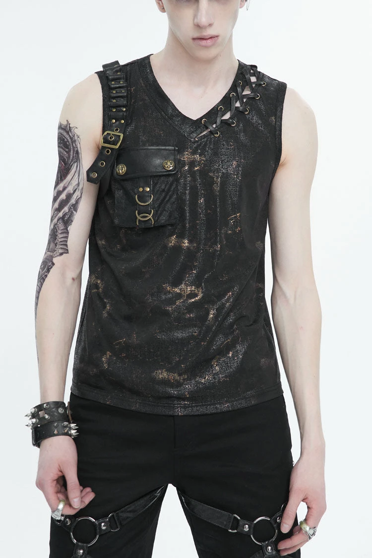 This punk T-shirt is short sleeves and patchwork with ripped fabric. Hollow-out on the left shoulder. A detachable strap connects from the front to the left shoulder.