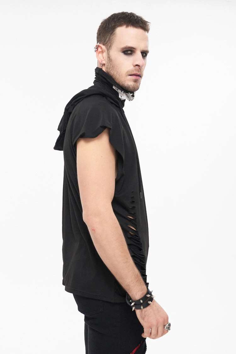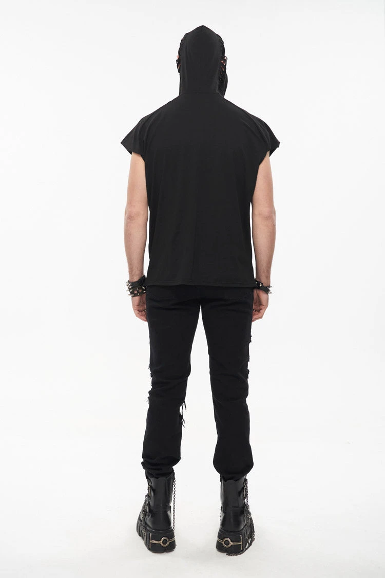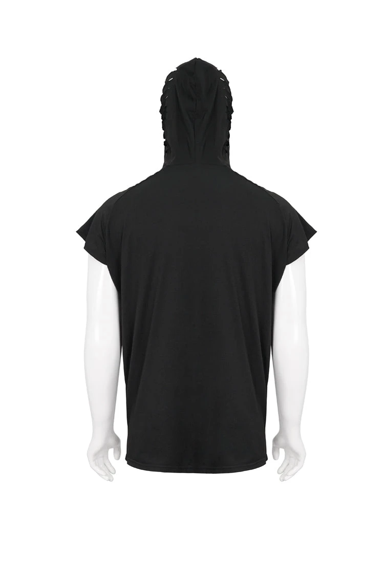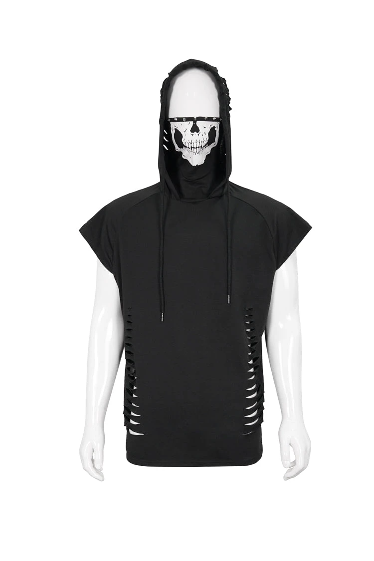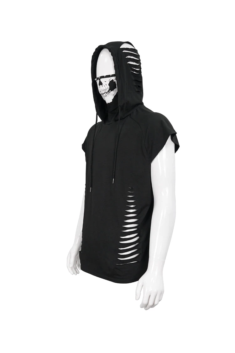 The raglan sleeve Hoodie designed with elastic knitted fabric has holes cut on both sides of the waist and on the hat. The high collar can cover the face, printed with skull print, and the edge is nailed. Suitable for daily wear.