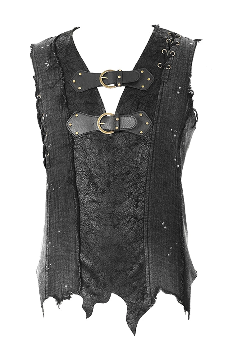 Wearing a vest directly onto the bare body is something that resembles the look of the one that gladiators have. This gothic vest is just like that. Without sleeves and deep V-neck opening, it is ripped at the ends and finishes in a small wrap-up. The only accented details are the two belts positioned directly on the v-neck opening.