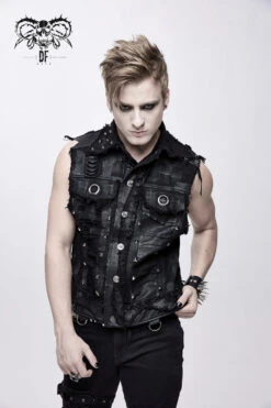 Black Hooded Tattered Chest Lace Up Metal Buckle Knit Men’s Punk Vest