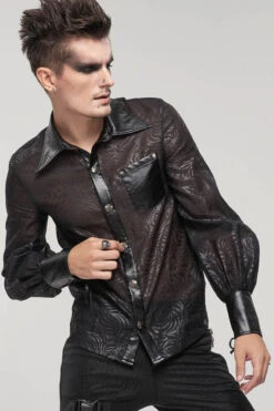 Black Stand Collar Long Sleeves Faux Leather Splice Men’s Gothic Shirt