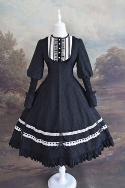 Black Elegant Vintage French Rose Print Square Collar Ruffled Classic Lolita OP Dress
