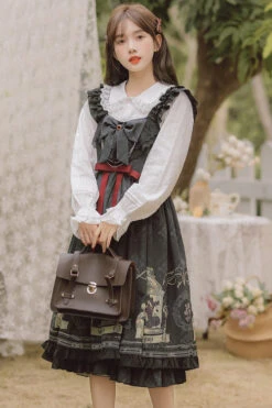 Black Elegant Vintage French Rose Floral Print V Collar Sleeveless Ruffled Classic Lolita JSK Dress