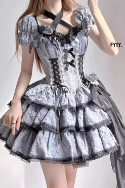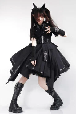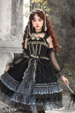 Black Ruffled Strap Mesh Lantern Sleeves High Waisted Irregular Hem Gothic Lolita OP Dress