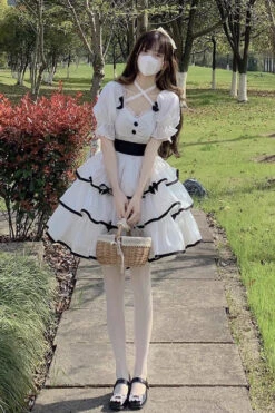 White Cotton Square Collar Short Sleeves Floor Length Multi-Layer Victorian Gothic Lolita Dress