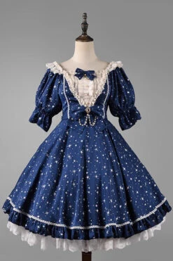Midsummer Galaxy Shiny Star Print Short Sleeves Ruffle Bowknot Sweet Lolita OP Dress