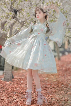 Japanese Trumpet Sleeves Lace Ruffled Cherry Blossom Print Sweet Lolita OP Dress