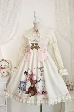 Ivory Sheep & Bear Print Alice Girl Bowknot Ruffled Sweet Lolita JSK Dress