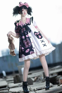 Multi-Color Lapel Collar Short Sleeve Single Breasted Bear Print Sweet Lolita Dress