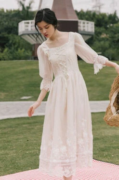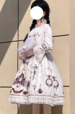 White Lantern Half Sleeves Lace Floral Embroidery Print Sweet Lolita Op Dress