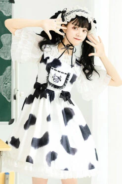 White Cow Pattern Print Bowknot Ruffled Sweet Lolita JSK Dress