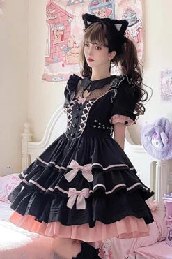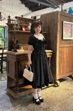 Black Lapel Collar Bowknot Long Sleeves Ruffled Sweet Lolita Maid OP Dress (Apron Is Included)