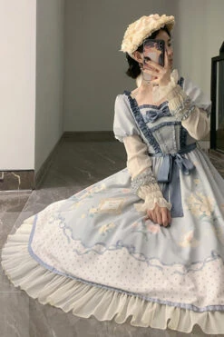 Blue Ruffled Square Collar Floral Print Puff Long Sleeve High Waist Sweet Lolita OP Dress