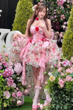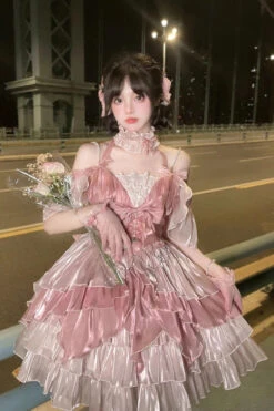 Pink Candy Party Lace Long Sleeves Bowknot Multi-Layer Ruffled Sweet Lolita JSK Dress