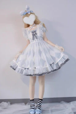 White/Black Cat Print Ruffle Bowknot Maid Sweet Lolita Dress