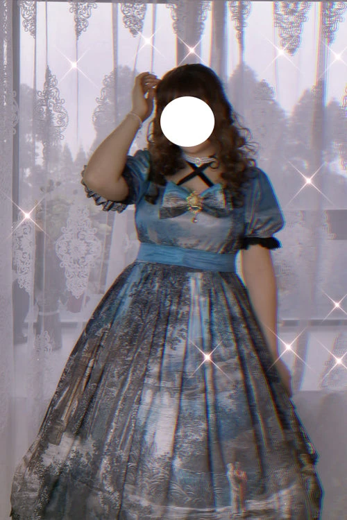 Black Square Neck Organza Print Ruffled Lantern Sleeves High Waisted Sweet Lolita OP Dress