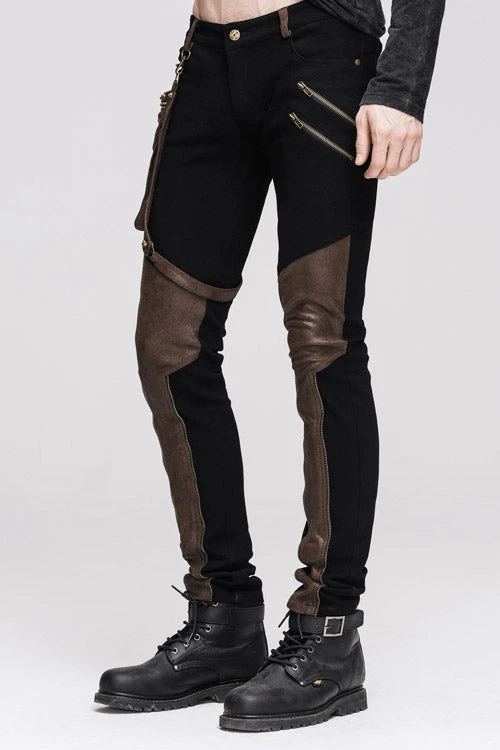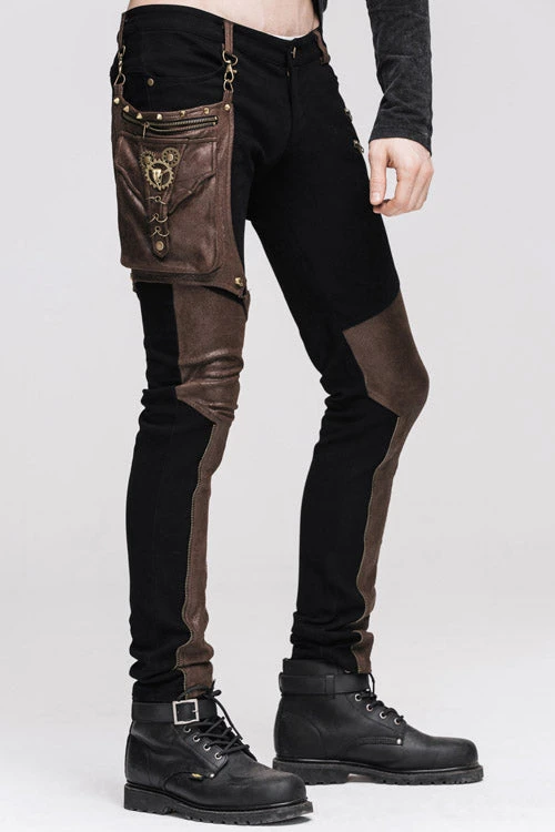 The main fabric is made of black elastic twill fabric. The leg bag and the front leg are stitched with coffee ironing glued fabric. The leg bag is decorated with intersection and metal rings,which is detachable.Suitable for everyday and party wear.