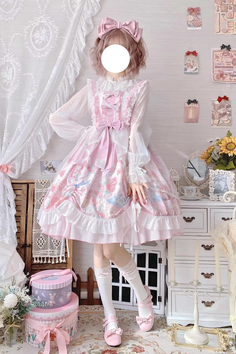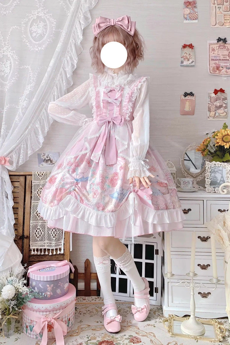 Pink Elegant Vintage French Rose Floral Print V Collar Sleeveless Ruffled Classic Lolita JSK Dress