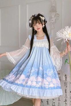 Blue Chinese Mythology Print High Waist Lace Trim Sweet Lolita JSK Dress