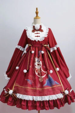 Red Lion Stepping On Hydrangea Print Bowknot Long Sleeves Multi-Layer Ruffled Sweet Lolita OP Dress