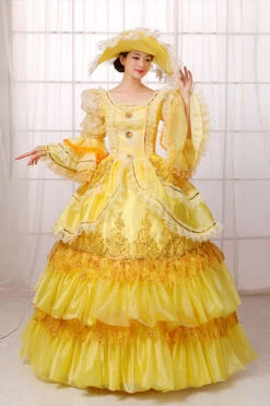 Yellow Hime Sleeves High Waisted Lace Stitching Gem Button Multi-Layer Victorian Lolita Prom Dress