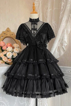 Black/White Cotton Stand Collar Long Sleeves Bowknot Ruffled Multi-Layer Gothic Lolita Dress