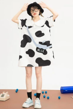 Black/White Doll Collar Short Sleeves Milk Cow Print Sweet Lolita Dress