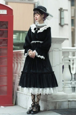 Black Doll Collar Bear Print Puff Sleeves Ruffled Sweet Lolita OP Dress