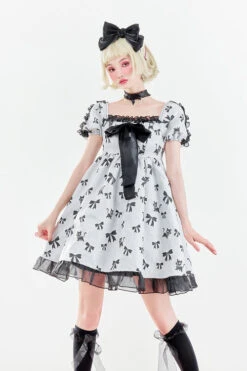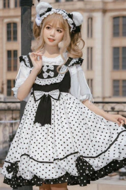 White/Black Polka Dot Print Bowknot Princess Sweet Lolita Suspender Dress