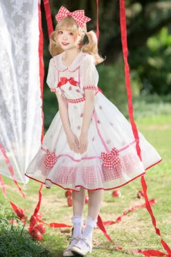 White/Red Round Collar Short Sleeves High Waist Strawberry Print Sweet Lolita Dress