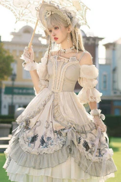 White Square Neckline Butterfly Print Short Sleeves Fungus Ruffled Sweet Lolita OP Dress