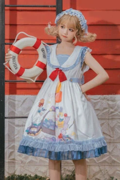White/Blue Sailor Collar Delicious Food Print Ruffled Sweet Lolita Suspender Dress