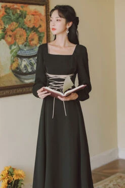 Black Solid European Manor Square Collar Long Sleeves High Waisted Classic Lolita OP Dress