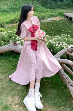 Pink Navy Lapel Collar Check Short Sleeves High Waisted Long Plus Size Sweet Lolita Dress