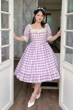 Purple Square Collar Heart Print Ruffled Short Sleeves Plus Size Sweet Lolita OP Dress