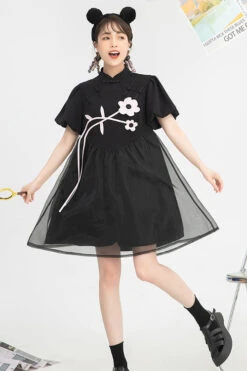 Black Stand Collar Lantern Short Sleeves Floral Print Organza Panel Sweet Lolita Dress