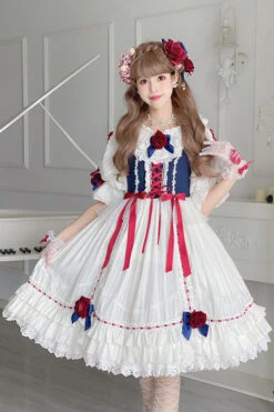 Blue/White Round Collar Bowknot Short Sleeves Multi-Layer Ruffled Sweet Lolita OP Tiered Dress