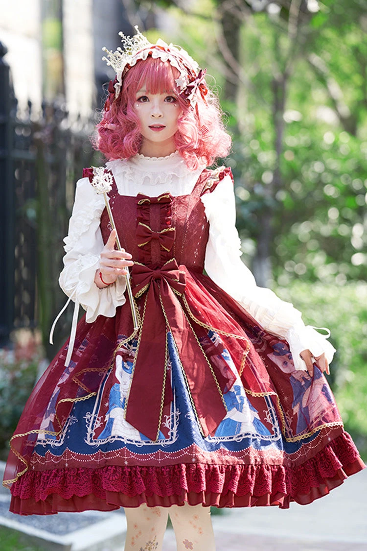 Red Hollow Embroidery Floral Print Half Sleeves High Waisted Victorian Lolita Prom Dress