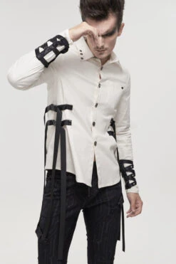 White Punk Nylon Strap Metal Buckle Decoration Long Sleeve Elasticity Thick Men’s Shirt